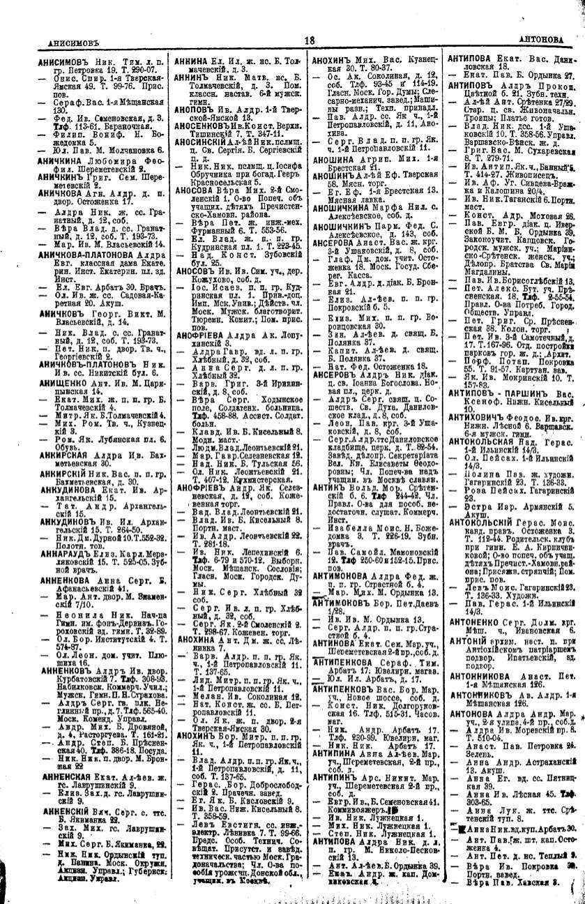 Алфавитный указатель адресовъ жителей г. Москвы и ея пригородовъ - page 18