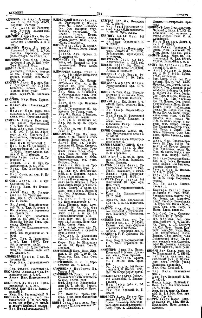 Алфавитный указатель адресовъ жителей г. Москвы и ея пригородовъ - page 237