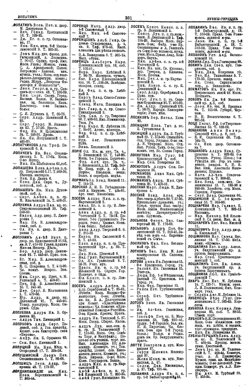 Алфавитный указатель адресовъ жителей г. Москвы и ея пригородовъ - page 299