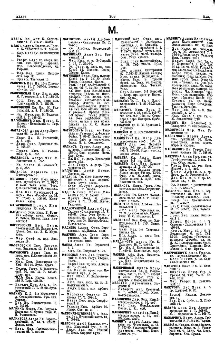Алфавитный указатель адресовъ жителей г. Москвы и ея пригородовъ - page 306