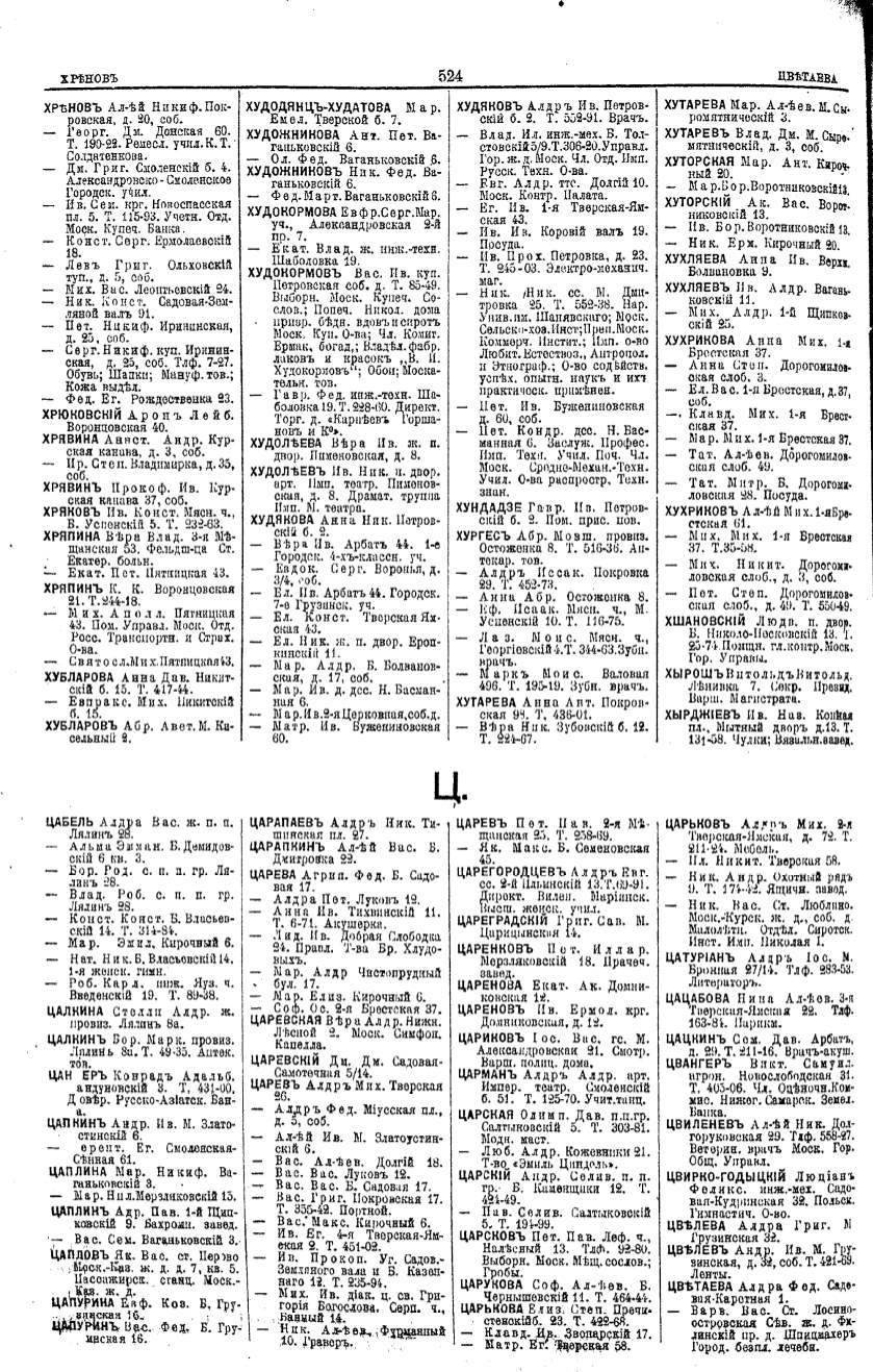 Алфавитный указатель адресовъ жителей г. Москвы и ея пригородовъ - page 522
