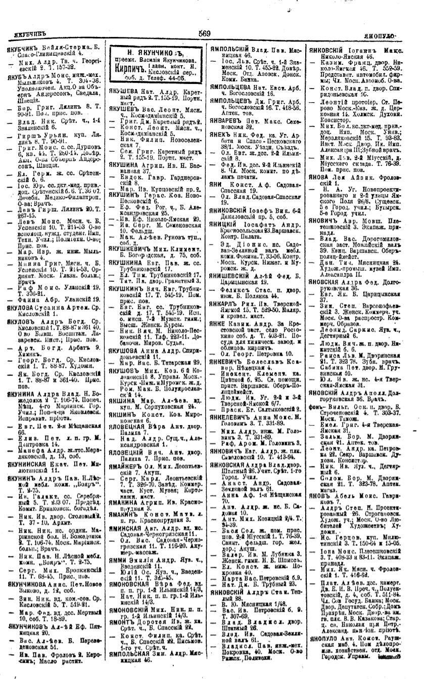 Алфавитный указатель адресовъ жителей г. Москвы и ея пригородовъ - page 567
