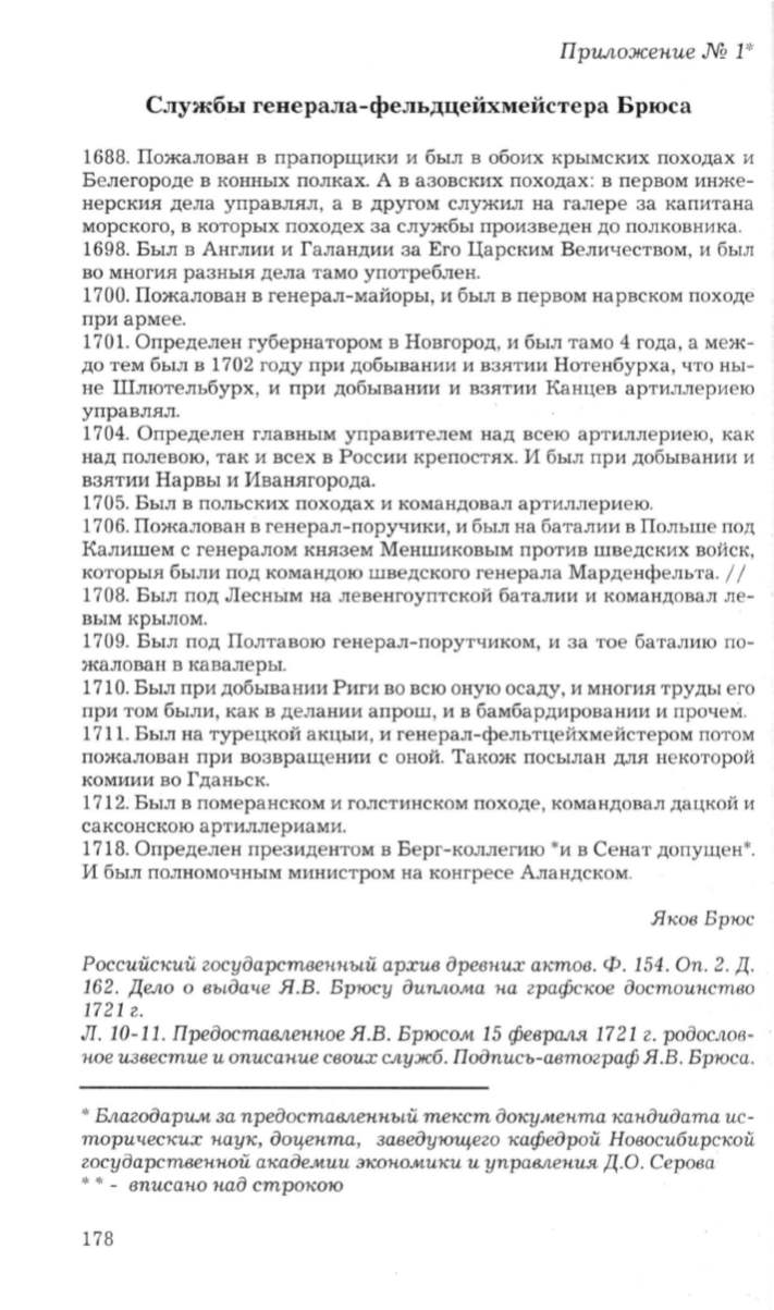 ное известие и описание своих служб. Подписъ-автоzрафЯ.В . Брюса .