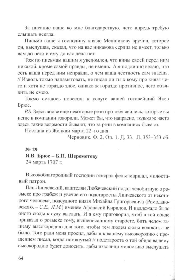 Я.В. Брюс- Б.П. Шереметеву