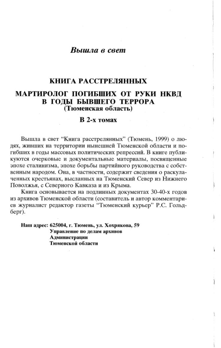 Вышла в свет "Книга расстрелянных" (Тюмень,