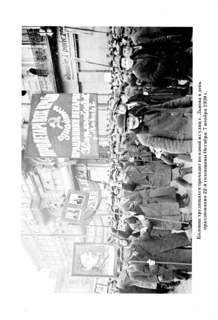 Колонна трудящихся проходит по одной из улиц г. Львова в день