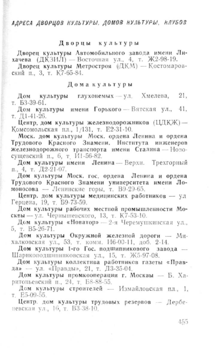 АДРЕСА ДВОРЦОВ НУЛЬТУРЫ, ДОМОВ НУЛЬТУРЫ,