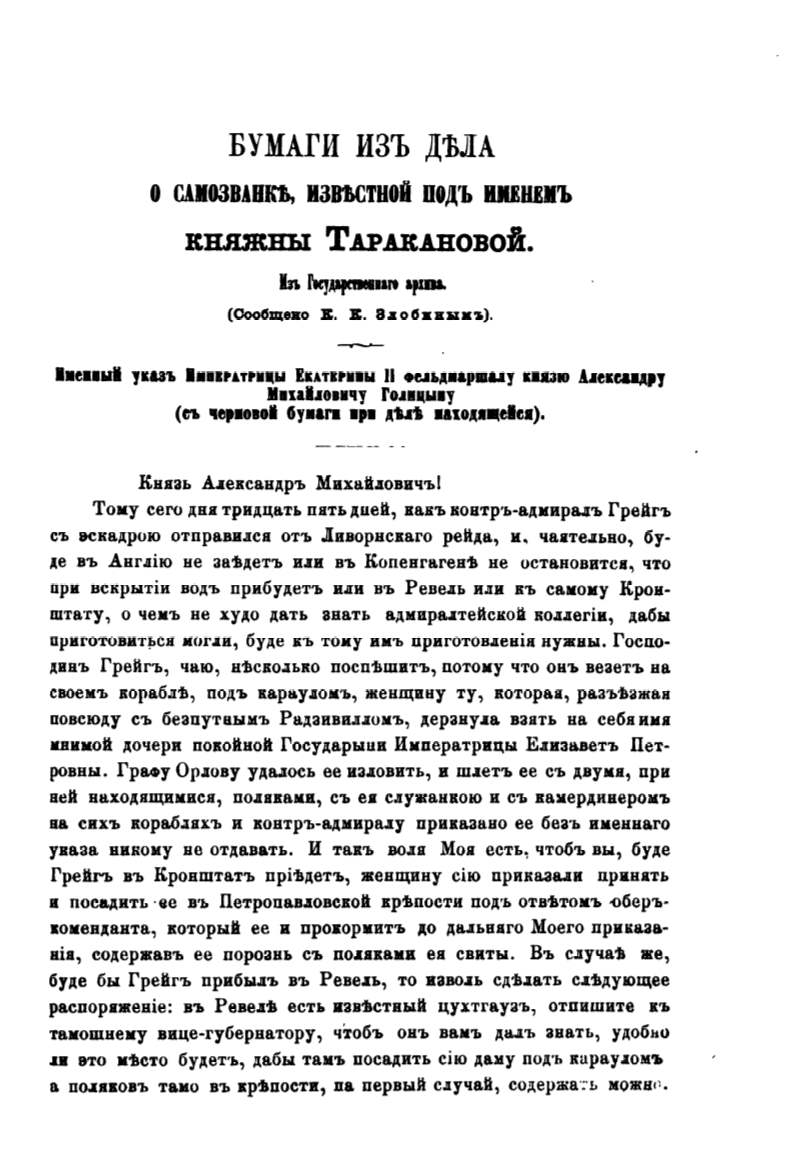 и посадить ·ее в·ь Петропав.11овской кр'Ъпости под·ь отв'hтомъ -оберъ