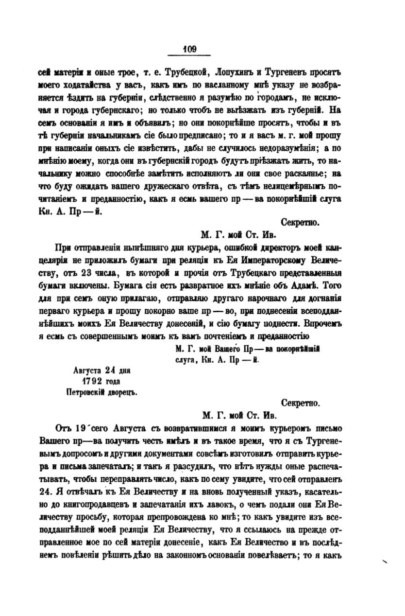 'сего Августа съ возвратившимен и МОИIIЪ курьеромъ письмо
