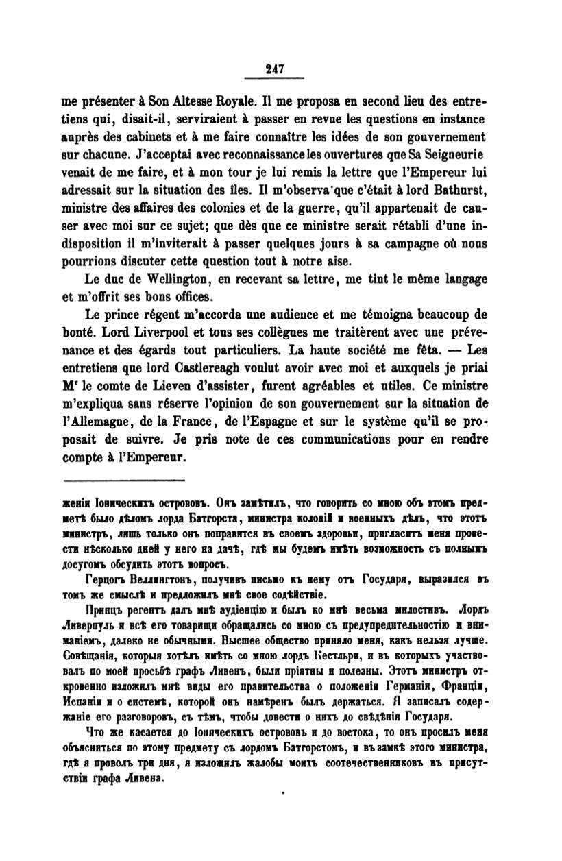 entretiens que lord Castlereagh voulut avoir avec moi et auxquels je priai