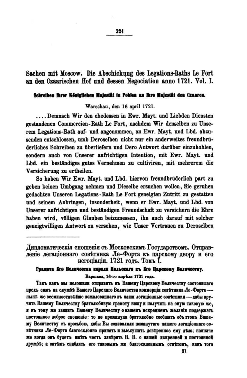 an den Czaarischen Hof nnd dessen Negociation anno 1721. Vol. 1.
