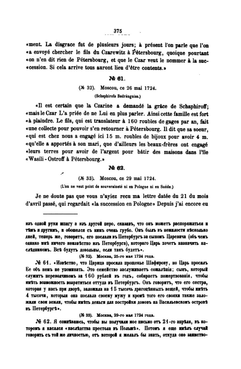 Иавtетво, что Царица проеuа прощенье Шафирову, но Царь просв..п.
