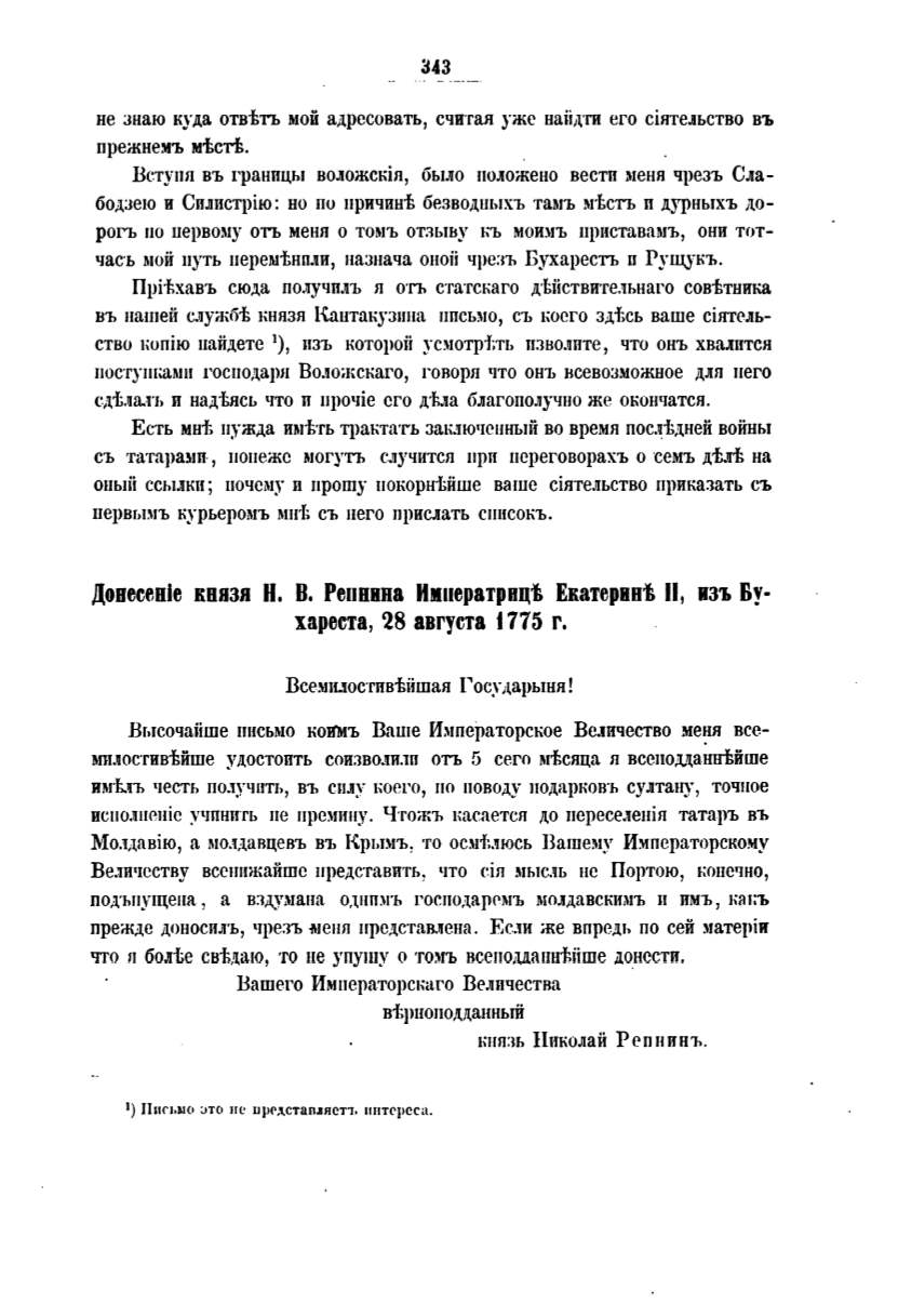 Довесевlе князя Н. В. Репвина Ив•rератрнцt Екатерввt
