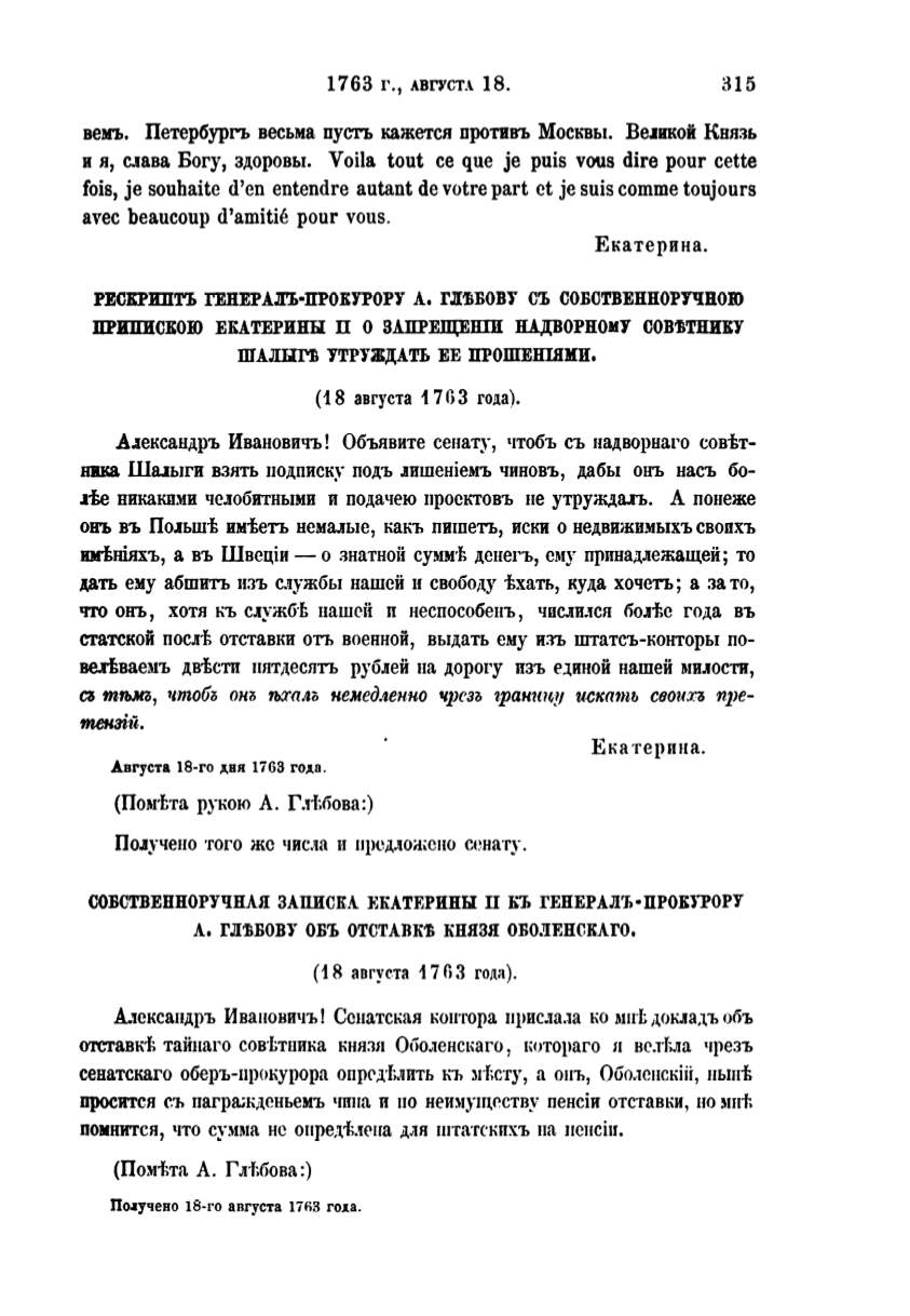 А.1ександръ Ивановичъ! Объявите сенату, чтобъ съ надворнаго совtт