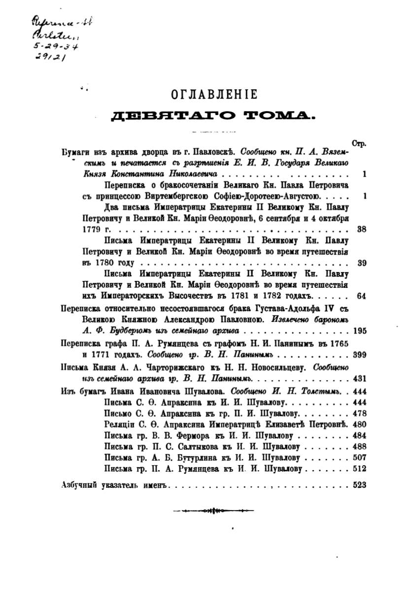 Uукагв нsъ архива дворца въ г. Паuовскt. Сообщено кн. П. А. Вязе~-