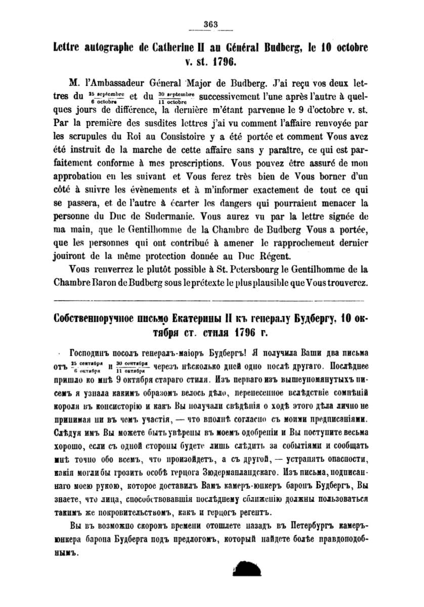 Господинъ посолъ гепералъ-маiоръ Будбергъ! Я получила Ваши два письма