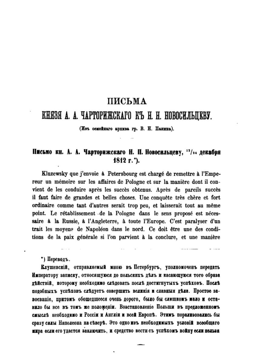 КННЗН А. А. ЧАРТОРИЖGШО КЪ Н. Н. НОВОСИЛЬЦЕВУ.