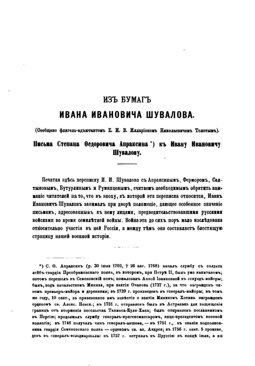 Печатав здtсь переписку И. И. Шува.11ова съ Апраксинымъ, Ферморомъ, Саж